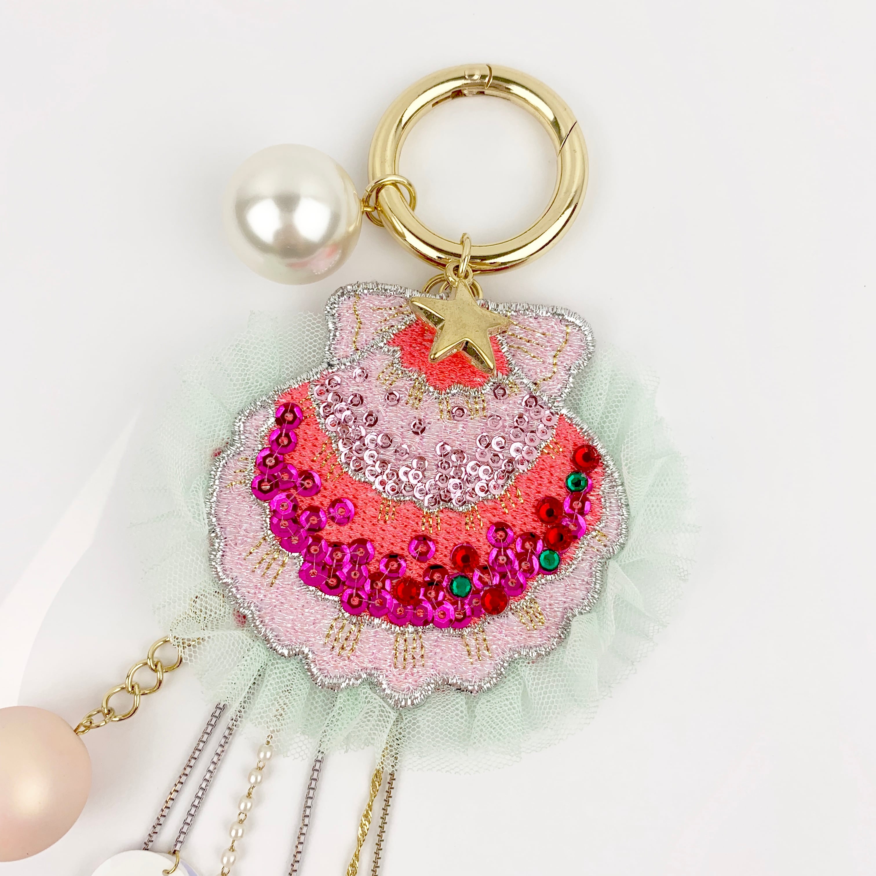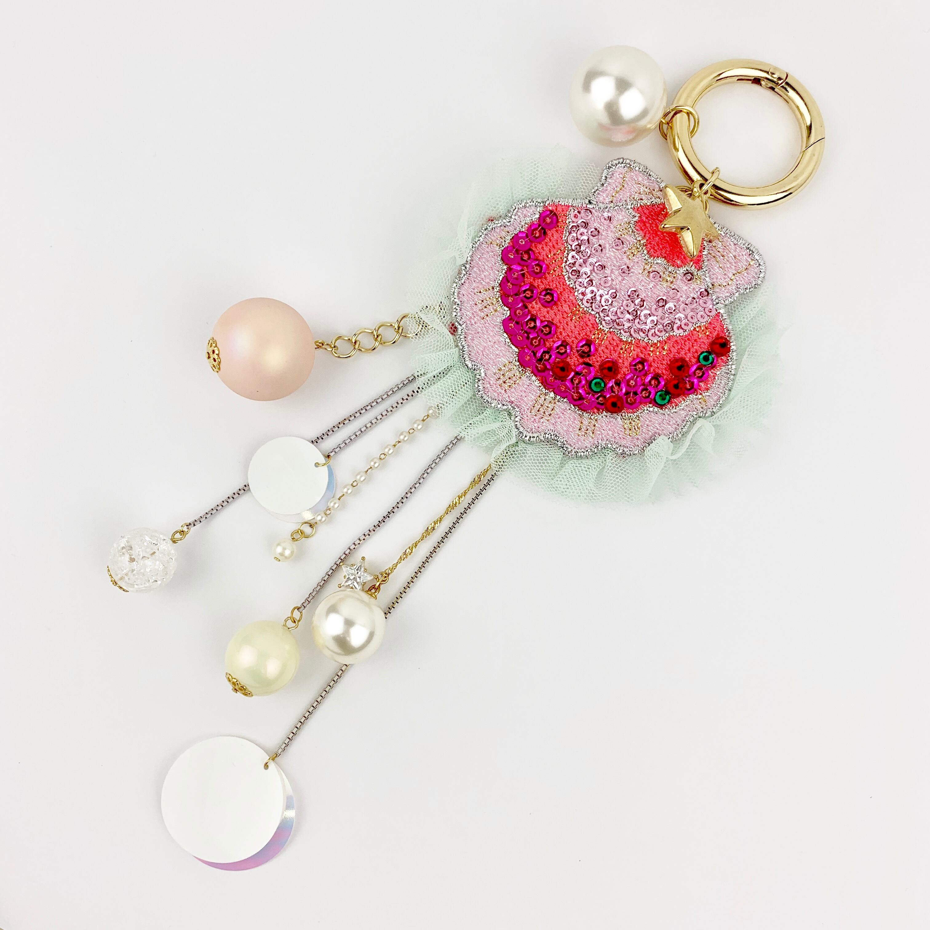 シェル、パール、チュールなどガーリーなものを詰め込んだバッグチャーム♡