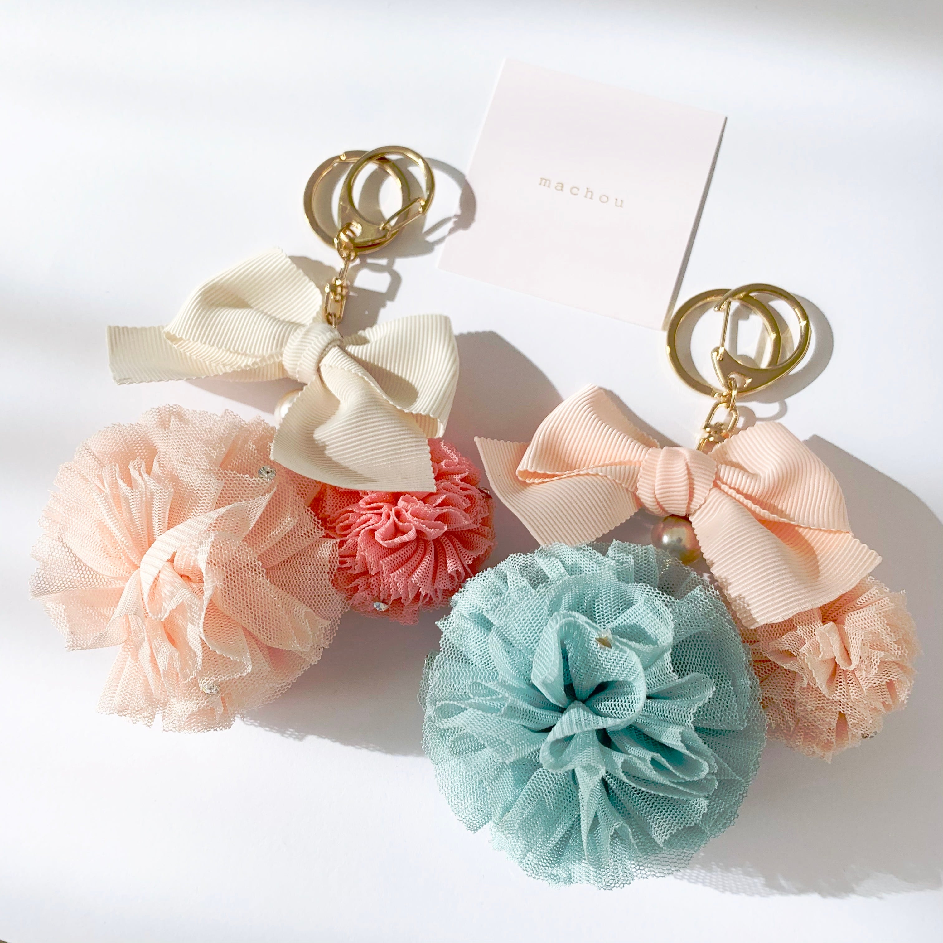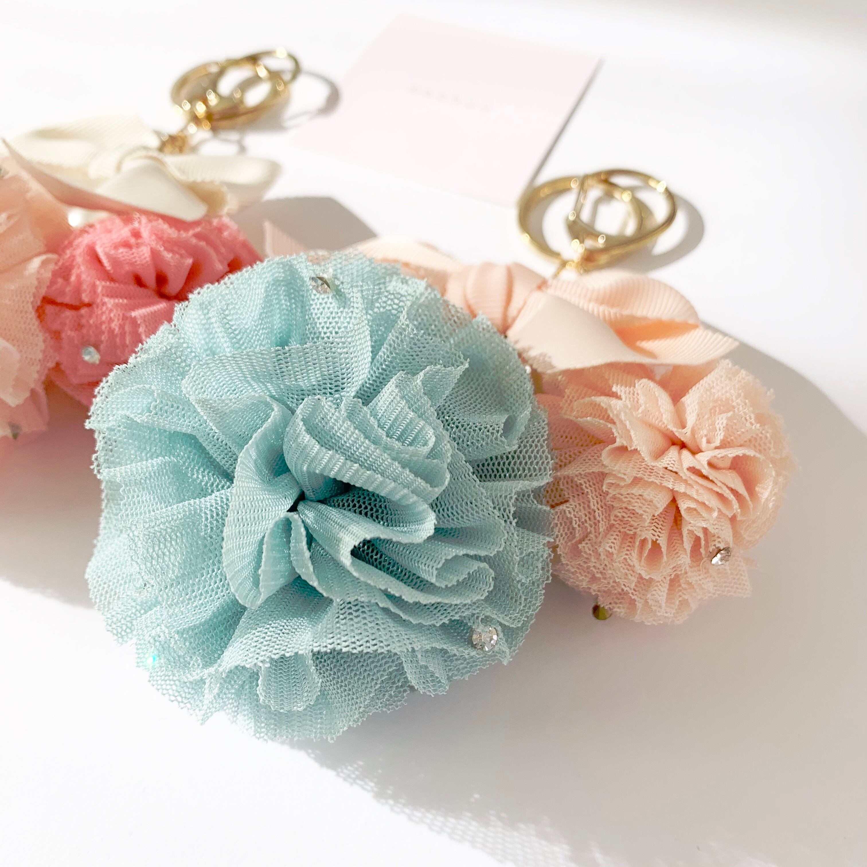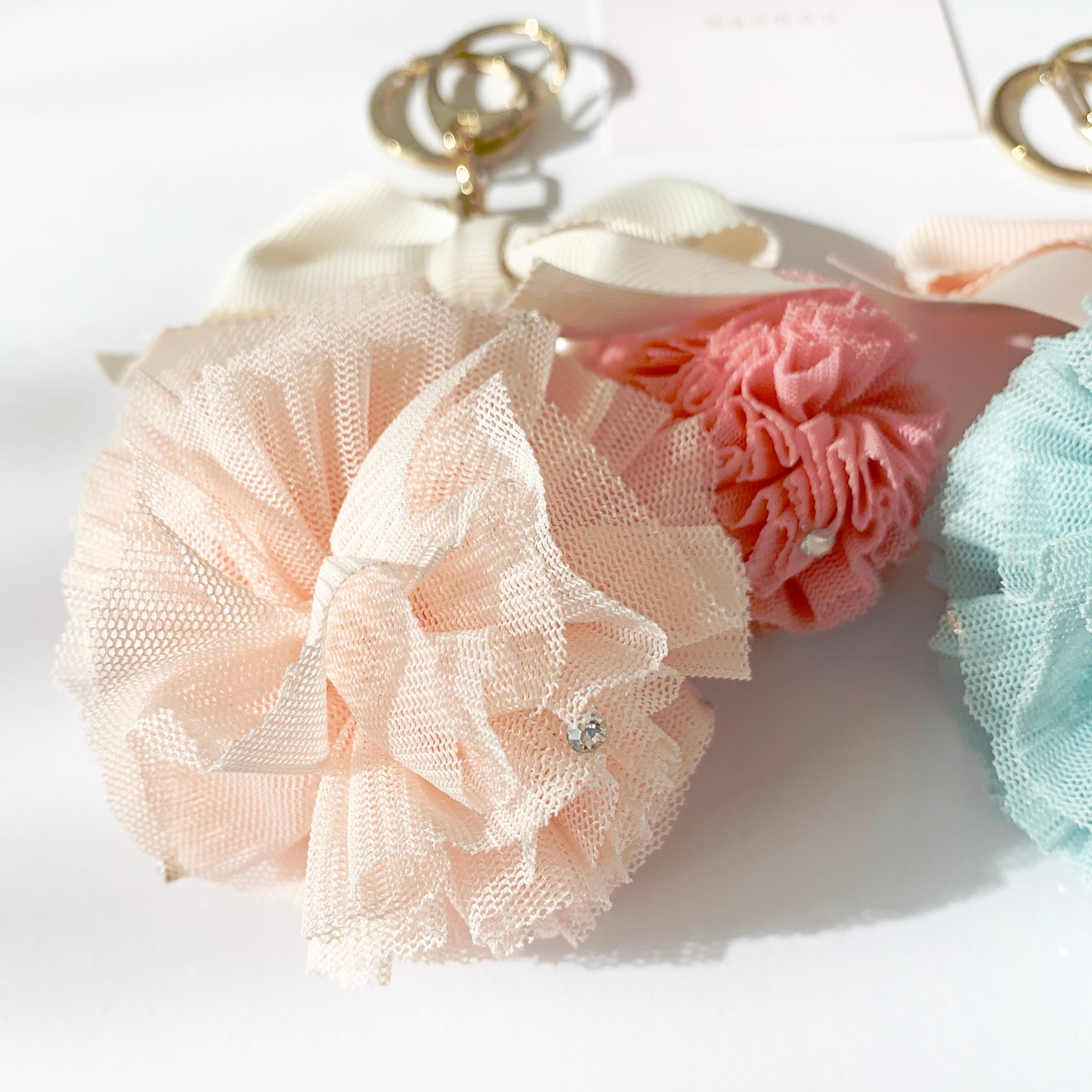 リボン、チュール、ラインストーン、パールの組み合わせがとびきりガーリーなチャーム♡